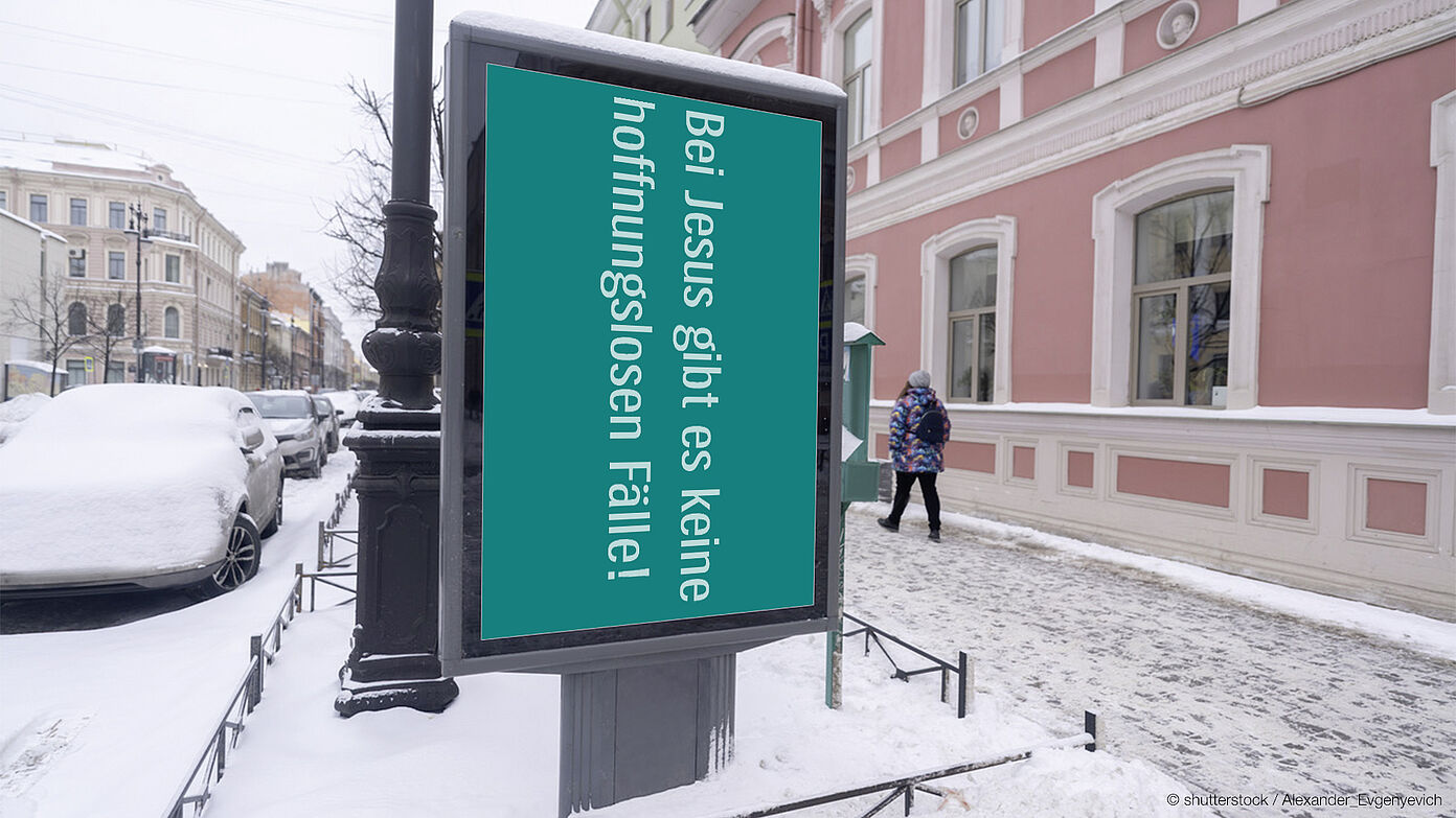 „Bei Jesus gibt es keine hoffnungslosen Fälle“, steht auf seinem Plakat.