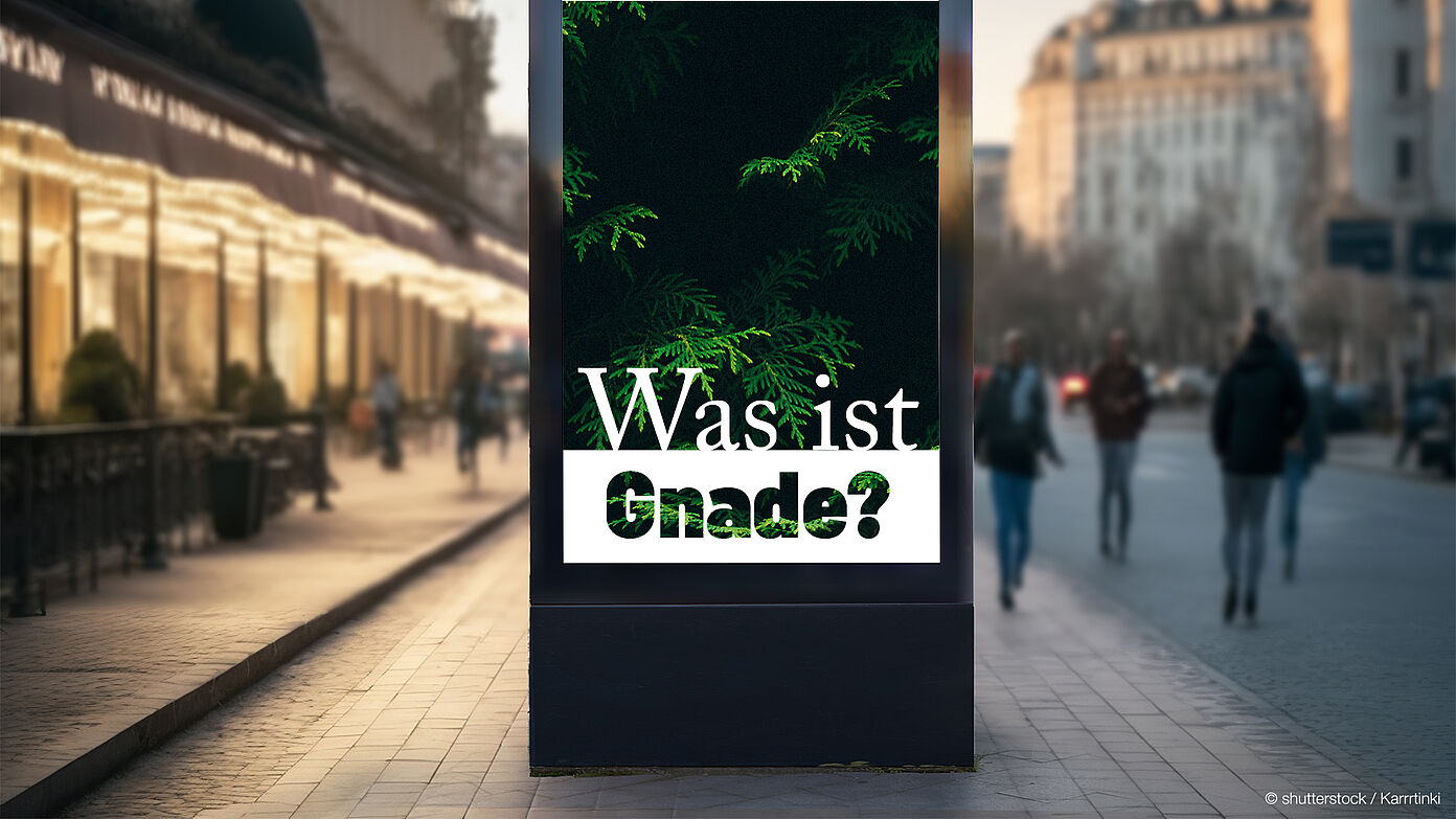 „Was ist Gnade?“ steht auf seinem Plakat.