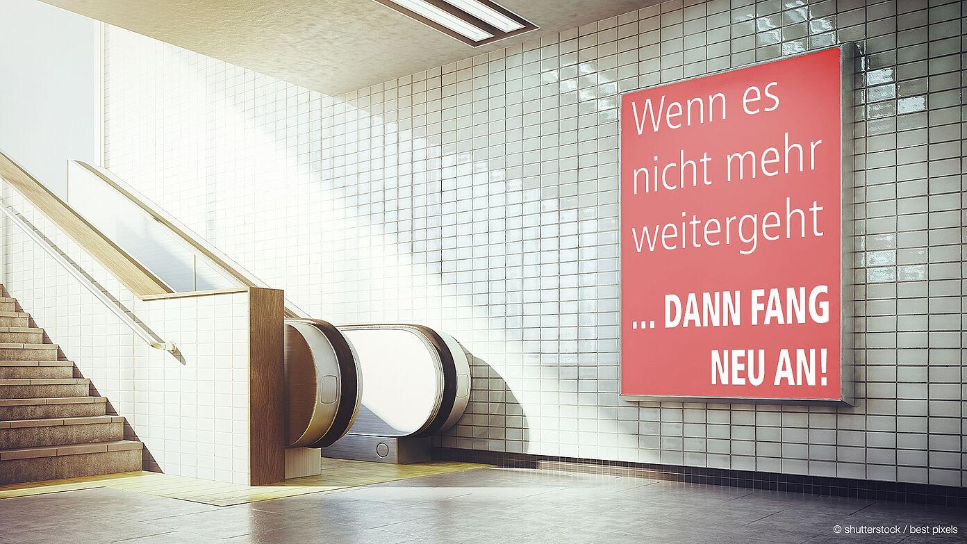 „Wenn es nicht mehr weitergeht … dann fang neu an!“ steht auf seinem Plakat.